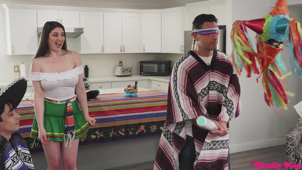 All Ricky Spanish wants for Cinco de Mayo is margaritas and pussy. He isn't picky about which pussy, but he wouldn't mind getting it on with his bigtit babe of an adopted sister, Alyx Star. Alyx feels pretty into Ricky as well, so she's not shy about looking for an excuse to flirt with him. They agree that they want a party, but their stepdad Ryan Driller tells them it's not allowed. Cinco de Mayo is a holiday with a lot of meaning and Ryan wants to teach them about it. Alyx agrees, but only if they can have a special pinata.Later, Alyx has just finished setting up the pinata when Ryan tries to sit down and deliver a history lesson. Alyx says she'd like to do the pinata first and even offers to let Ryan have the first swing. Ryan agrees and busts it open on the first try! Out fall a variety of sex toys mixed in with the expected candy. That infuriates Ryan, who insists that Alyx use the toy right now in front of both him and Ricky as a punishment. Since that's exactly what Alyx wanted in the first place, she's all in. Watching his stepsis vibing with her dildo just gets Ricky excited, which prompts Ryan to tell his stepson to help his adopted sis out. That just makes Alyx even hornier, so she goes for Ricky's dick to start sucking him off!Ryan can barely believe what he's seeing, but once Ricky gets behind Alyx to lick her pussy, Alyx reaches out to tug her adopted stepdad's cock out. Ryan tries to disengage, but Alyx isn't having it and Ryan doesn't truly want to stop having such a hottie sucking him off. Ricky eventually goes from pussy eating to fucking his adopted sis in doggy as Alyx muffles her moans on her stepdaddy's hardon. Ricky takes a seat and Alyx turns around to deep throat him as Ryan bangs her on her side. Next, Ryan takes a seat so Alyx can ride him in cowgirl while continuing to make love to Ricky's cock with her mouth. She gives Ricky a reverse cowgirl ride while Ryan takes a handie until he pops right in Alyx's mouth. Cum dripping down her breasts, Alyx moans in delight as Ricky drives deep inside her and nuts to give her trimmed twat a festive creampie.