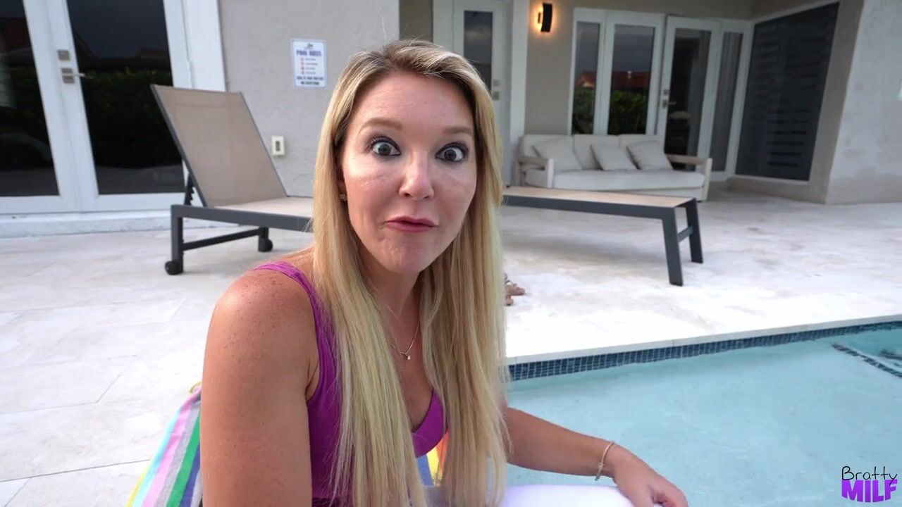 Juan is getting ready to hop into the shower when his stepmom Laura Bentley stops him. She needs him to clean his room so she can do laundry before he takes up the water. Later, Juan wants to make some food and Laura tells him no because she just cleaned it. Still later, Juan gets into it with Laura about a shelf in the garage.Finally, Laura joins Juan with her feet in the pool and confesses that she’s been really stressed because she isn’t getting any lately from Juan’s dad. Juan hesitantly agrees to help a mama out as Laura offers him her titties. Then she lays him down to blow him outside by the pool.They move in to the house so Laura can kneel on the couch and enjoy some doggy style. Getting Juan on his back again, Laura rides him in cowgirl and then some more in reverse cowgirl. She’s loving every moment of her stepson’s stiffie as she lets Juan plow her as she lays on her back. Laura finishes their impromptu fuck fest by blowing her stepson until he cums on her face.