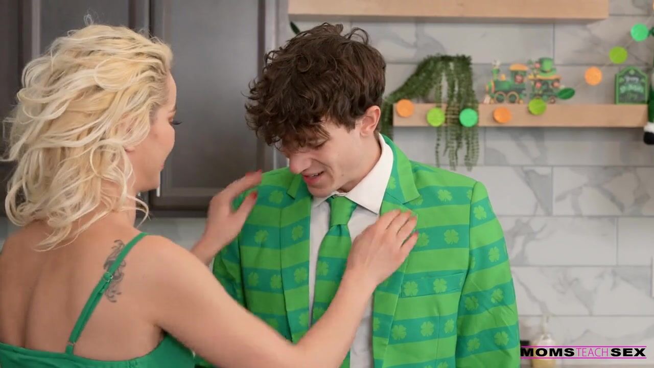 Cherry Kiss is making shamrock milkshakes for St. Patrick's Day when her stepson Parker Ambrose asks what she's up to. Cherry tells him he has to put on some green or she's going to start pinching him. When Parker returns, Cherry gives him the milkshake complete with whipped cream on top. Then she walks up to Parker and tells him she wants to taste his cream.Parker isn't about to say no to such a sexy offer. He pins Cherry against the kitchen island and slams into her from behind. Cherry lifts a leg, giving Parker better access to her cooch and making it easy to rub her own clit. Then she drops to a crouch so she can enjoy a deep throat BJ and some serious ball sucking.Urging her stepson onto his back, Cherry climbs on top of him and sinks down for a stiffie ride. She climbs onto the counter and turns onto her side so Parker can shove back home. Then Cherry rolls onto her back so her stepson can make her cum one last time. When Parker pulls out, Cherry holds up a milkshake for him to cum on so she can enjoy her treat topped with her stepson's cream.